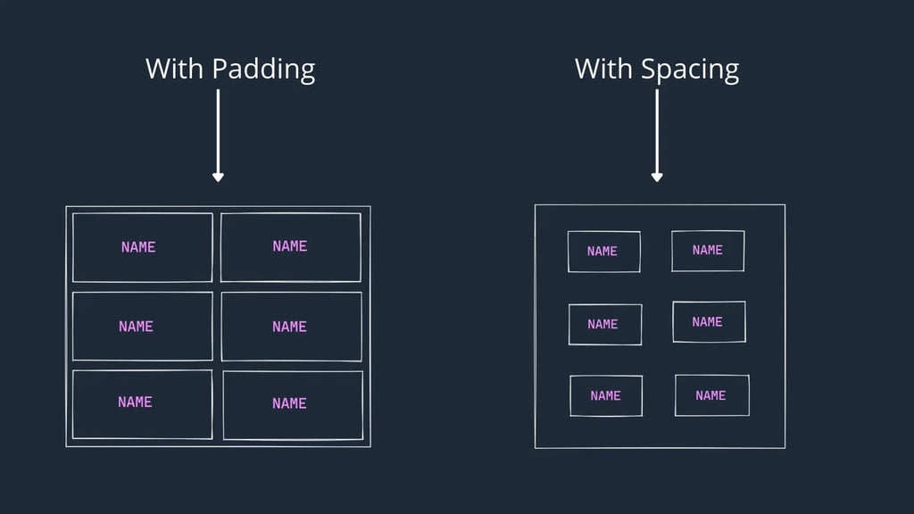 The below image is showing the difference between the padding and the cell spacing.