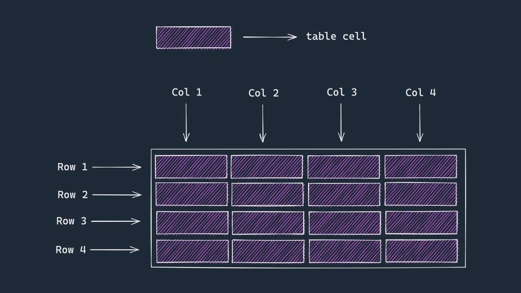 In web design, tables play a crucial role in organising data systematically.. They can represent data in rows and columns. Each row and column contain cells to store the data.